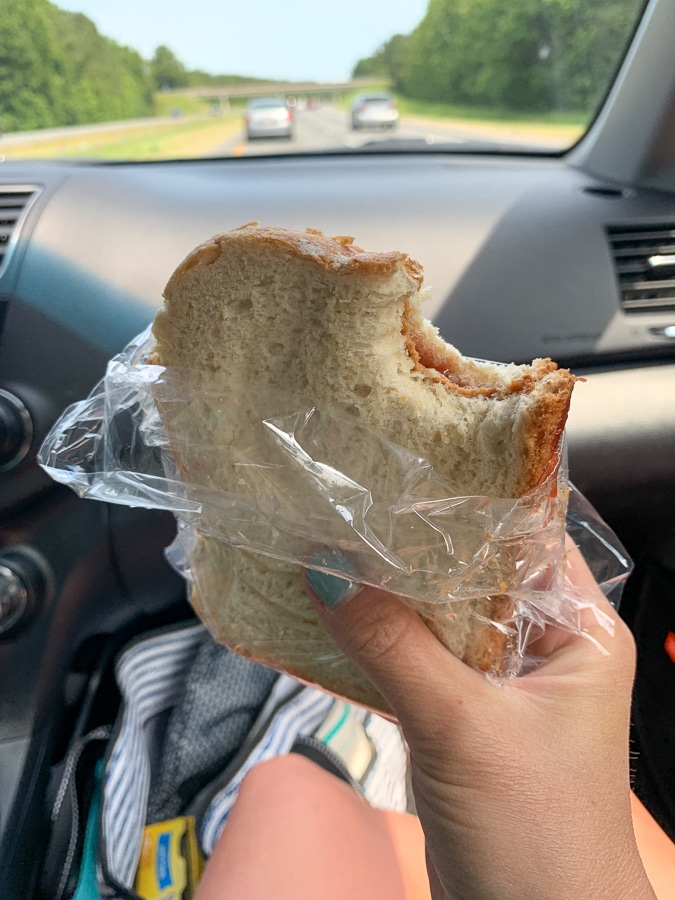 We set off on what is a 5.5 hour car trip with two adults. With two kids? It was more like 7 hours. We had to stop many times, we hit traffic, etc. etc. This PB&J on fluffy white bread was 100% delish.