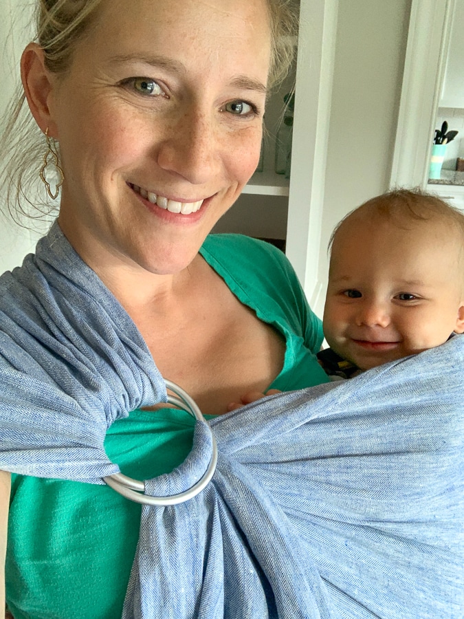 Look at what also came in the mail! B is getting so heavy to carry without any support, and my back is feeling it. While I love our Boba carrier, it’s not the most glamorous, so I bit the bullet and ordered this linen ring sling from Amazon for $39. While it’s not as supportive as a front carrier, I love that 1) It’s so quick to put on and 2) it’s dressy and doesn’t cut into my hips, so I can wear it at a party and still look and feel dressed up. Birchie obviously loves it too!
