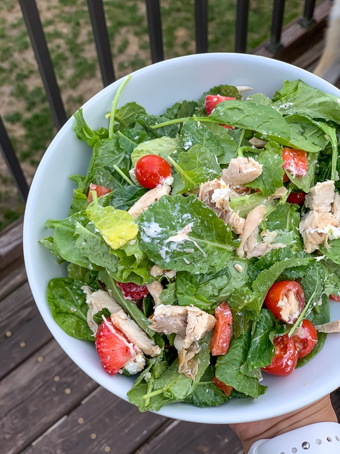 On post-vacation days, Thomas heads to the grocery store while I go on an unpacking frenzy, and we usually pick up a rotisserie chicken and make big salads for dinner. After a week of vacation food, our bodies were craving salad like crazy! In addition to chicken and greens, we had strawberries, peppers, tomatoes, goat cheese, candied pecans, and homemade dressing.